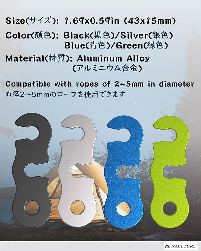- โ HIGH-QUALITY AND DURABLE ROPE TENSIONER - Replaces the cheap plastic cord tensor you already have on your camping and outdoor equipment, and say hello to these amazing, compact, and durable guy lines tensioner tent cords made of quality aluminum alloy which is ultralight, and convenient to carry in your backpack on a camping.