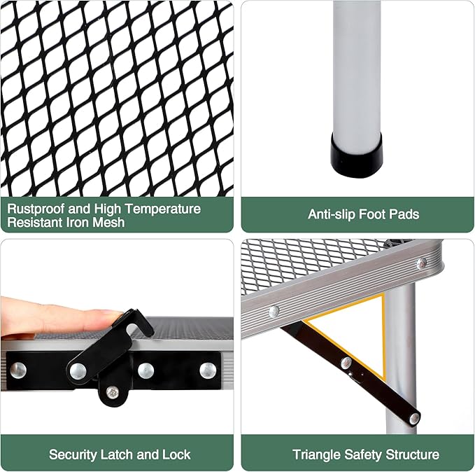 - High strength coated & heat resistant iron mesh (tabletop) and thicker aluminum alloy frame (diameter 25mm). X-shape side support and secure latch to ensure stablity.