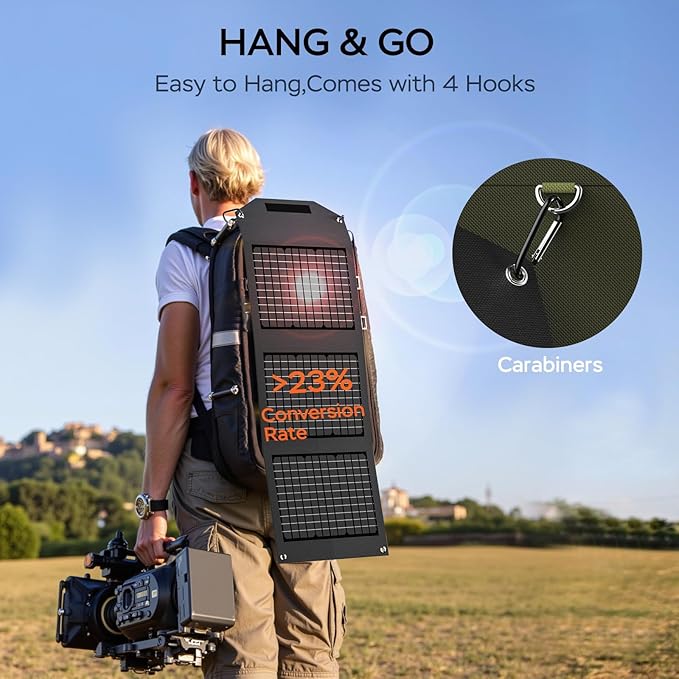 - HIGH EFFICIENCY: This foldable solar panel is made with high-efficiency solar arrays, achieving a conversion rate of 21.5-23.5% in converting solar power into electrical energy. The built-in smart chip intelligently recognizes your device, maximizing the charging speed while protecting against overcharging and overloading. This solar charger is perfect for outdoor use, making it an essential portable solar charger for camping trips, ensuring your solar panels efficiently charge smartphones, laptops, and other devices. The built-in smart charging technology can provide optimal and 100% safe charging in direct sunlight.