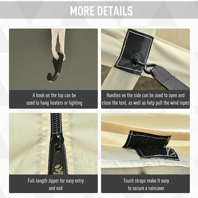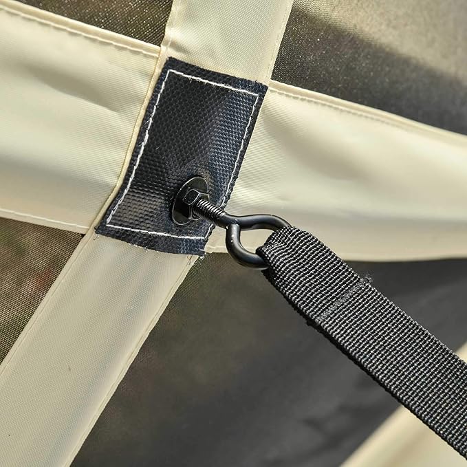 - Practical Design: 4 mesh sidewalls provide total air circulation and visibility so that you can enjoy a pleasant private space. There is a hook on the cabana ceiling that can be used to hang heaters or lighting. Furthermore, you can add a rain cover (not included) through the hook and loop straps on the outside of the tent.