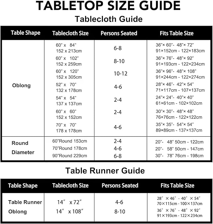 - LUSHVIDA Tablecloth Size Guide: Please measure your table size before purchase and calculate the proper size for a round or rectangular table. The available sizes are: table runner 14 x 72 inch; table runner 14 x 108 inch; Square 54x54 inch; Square 60x60 inch; Square 70x70 inch; rectangle 52 x 70 inch; rectangle 60 x 84 inch; rectangle 60 x 102 inch; rectangle 60 x 120 inch; round 60 inch; round 70 inch; round 90 inch.