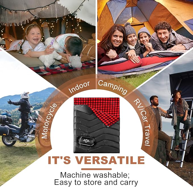 - 【3-in-1 Versatile Functionality】 This innovative double sleeping bag converts into two separate sleeping bag or 2 blankets/pads for flexible usage scenarios. The dual-zipper system features a bottom ventilation zipper for temperature control for added comfort. Whether you're craving a spacious lightweight double sleeping bag to weather chilly nights or need two separate pads for backpacking trips, this versatile design effortlessly caters to all your outdoor needs.