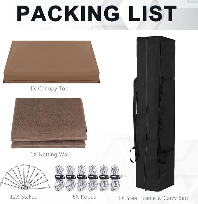 - ✔PARTS LIST AND ATTENTION: Parts included, 1X fully assembled powder-coated steel frame, 1X CPAI-84 Flame retardant silver coated canopy top, 1X mosquito netting wall, 1X 600D heavy stock wear resistant storage bag, 12X stakes and 6X ropes. If you have any questions, either pre-sales or after-sales, please feel free to let us know.