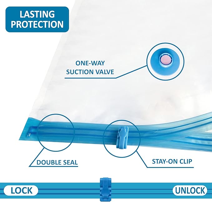 - Reliable protection: With the triple-seal turbo valve & double-zip seal design, our vacuum bags get the air out in the suction process. Can be used repeatedly.