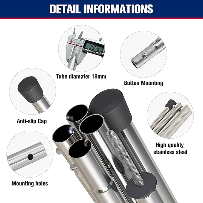 - THICKER DESIGN -- Newly upgraded thicker camping poles, made of high quality stainless steel material, the wall thickness of the poles is upgraded from 0.3mm to 0.6mm, which enhances the weight-bearing capacity of the tarp poles, the whole pair of poles weighs about 2.9lbs and can easily support your tarp!