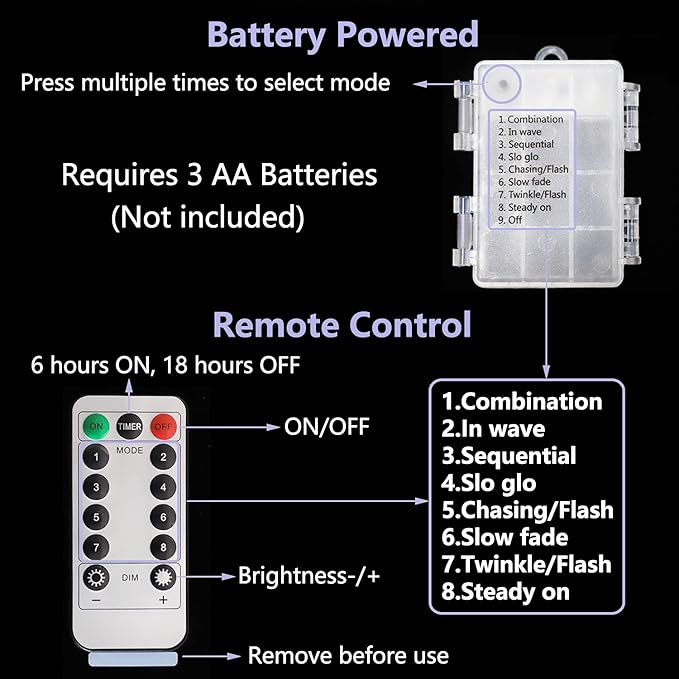 - 2.String Lights with Remote Control - Point the remote to the string lights, you can control the lights ON, OFF and lighting modes. And there are 8 different modes (combination, sea wave, sequence, Slo-Glo, chase/flash, slow fade in, blink/flash, steady light up) can be controlled by the button on the battery box.