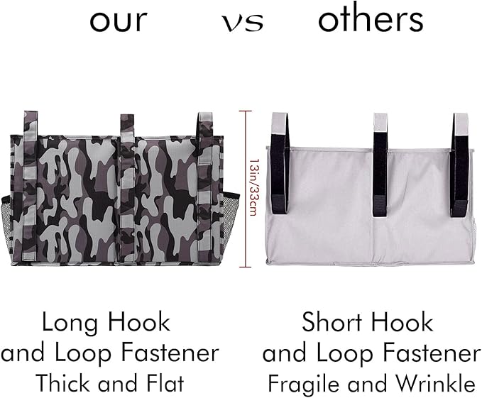 - Great Design: The hanging organizers have three adjustable heavy-duty hook and loop fastener belts that can be firmly fixed on the bed rail, and bed caddy organizers also can be hung stably on the head of the bed. The back of the bedside pocket with cardboard support is durable and can bear heavy weight. Easy to use, no assembly required.