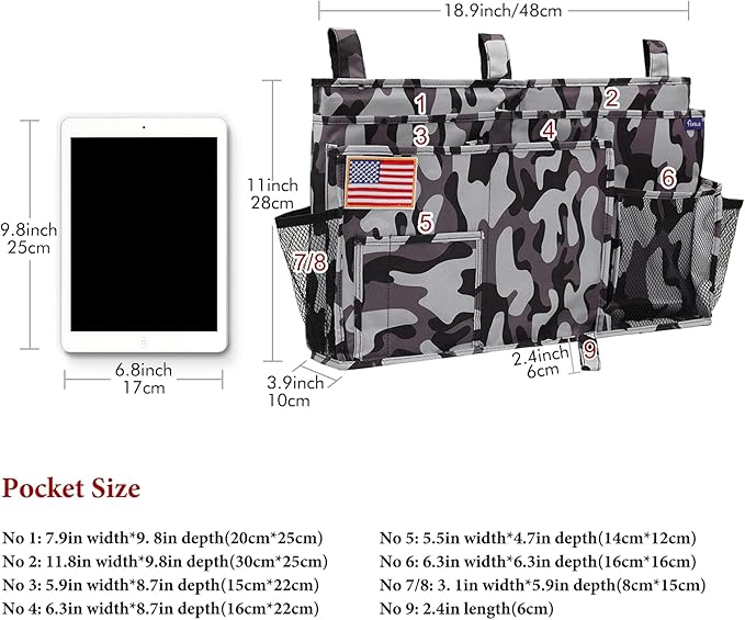 - Size: The large bedside caddy is 19*3.9*11 inches/48*10*28cm. The storage bag has 8 pockets that are bunk bed accessories, meeting the request for multi-storage.