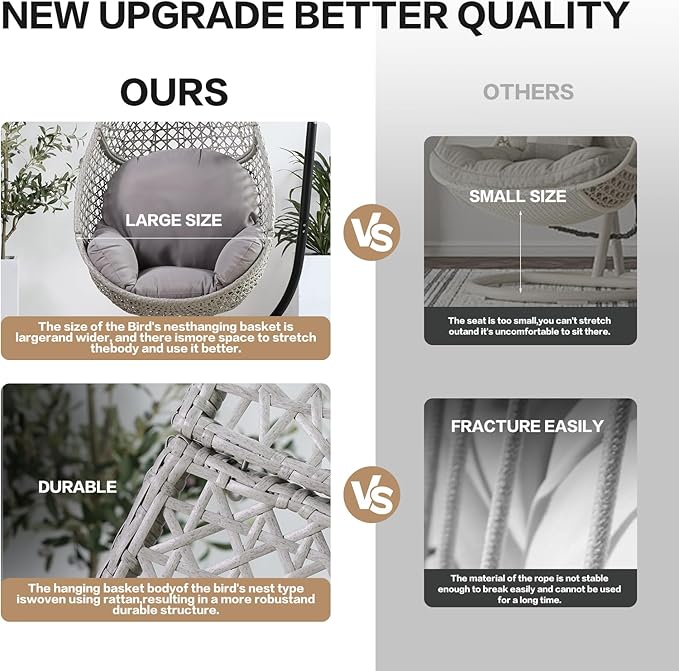 - [Sturdy & Durable Hanging Egg Chair] Egg swing chair is wrapped in high quality rattan wicker on a sturdy steel frame, the strong metal tube C stand with anti-rust powder coating on the surface can bear 330 pounds. The 4 metal feet evenly distribute the weight so that it won't roll over and ensure your safety.