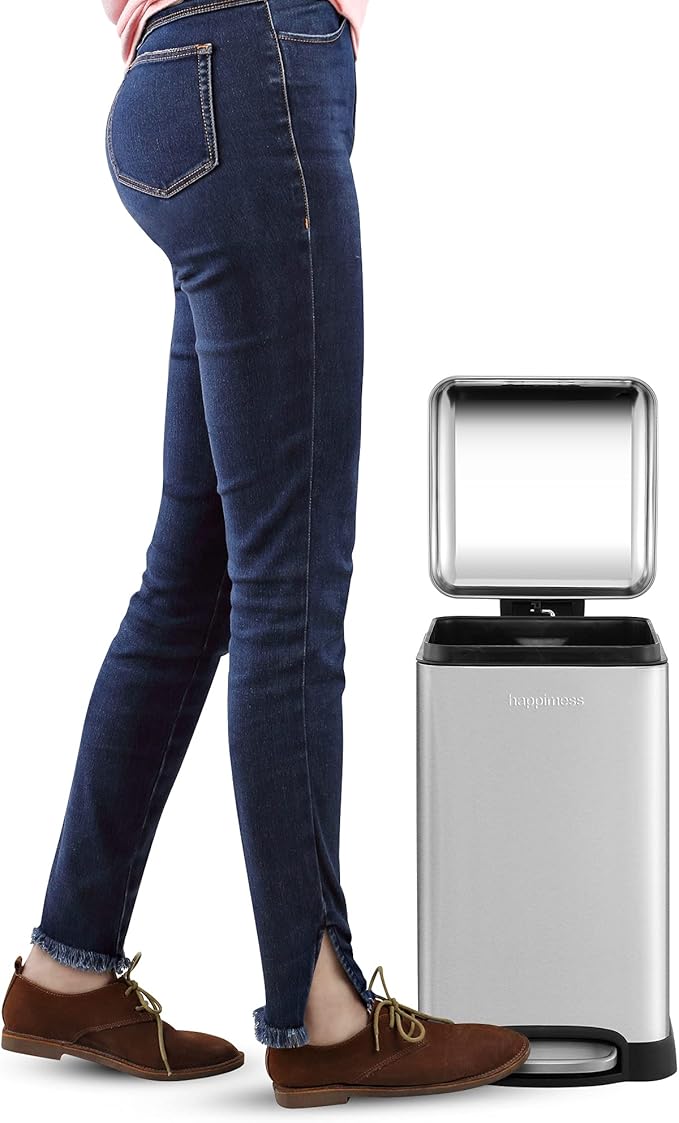 - STYLISH & PRACTICAL DESIGN: happimess Trash Cans clean-lined designs blend beautifully into your existing decor; Dispose of trash hands-free with our convenient step pedal; built-in damper lowers the lid quietly, and closes it tightly to keep odors inside