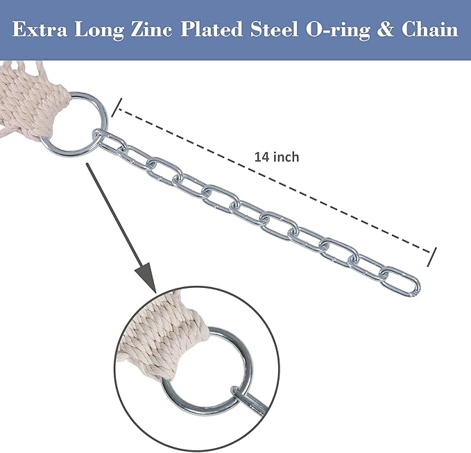 - Handcrafted Ropes: The heavy duty polyester ropes are hand-woven with comfortable, long-lasting threads woven by the hammock artisans. The 18 ropes are collected together and woven into a triangle pattern which is pleasing to eyes. O-shaped steel ring attaches the ropes and the chain