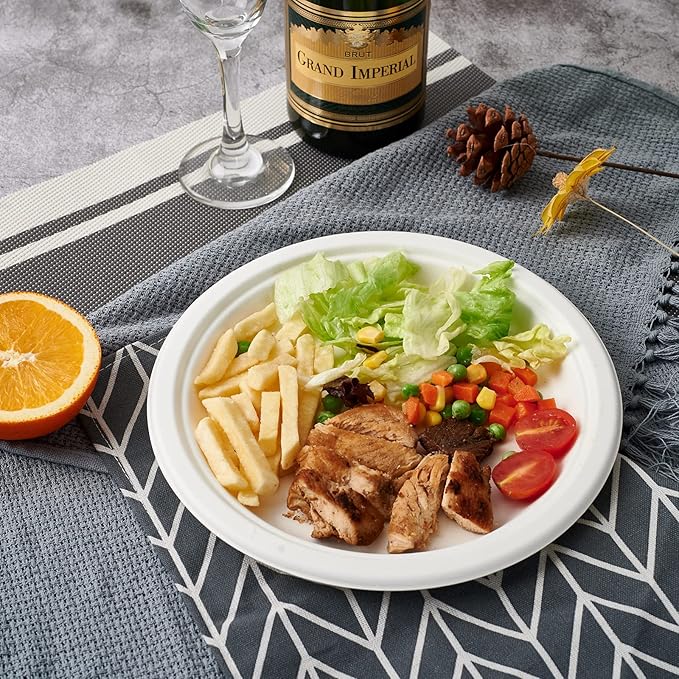 - 10-inch Paper Plates: Set includes 150 pack 100% compostable 10 Inch paper plates, White compostable plates can be matched with any food, perfect for serving sandwiches, burgers, pasta, salads, baked beans, french fries, and fruits