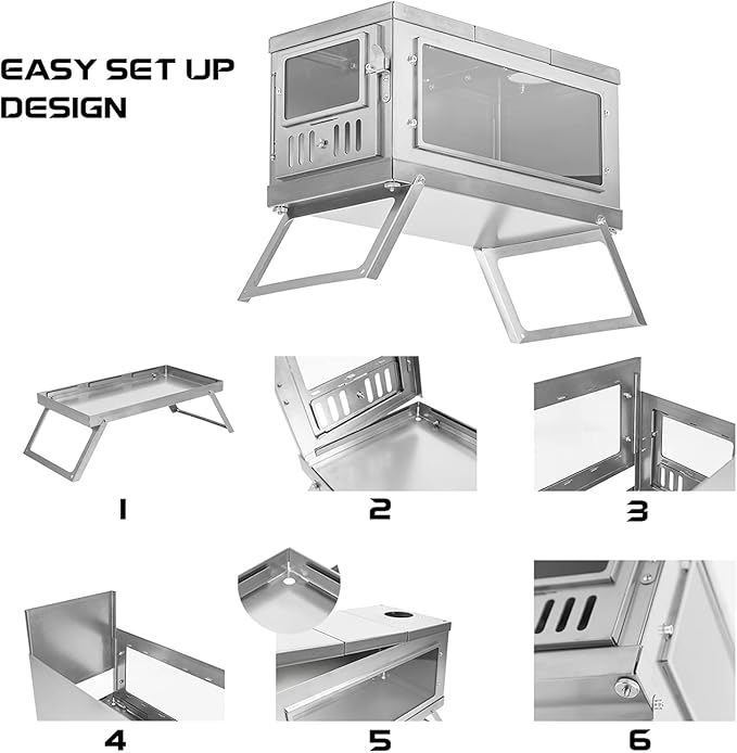 - 【DETACHABLE STOVE BODY DESIGN】We designed the four side walls of the Timber stove into an detachable structure. This structure not only makes the stove more portable, but also makes campers clean the wood stove more easily.