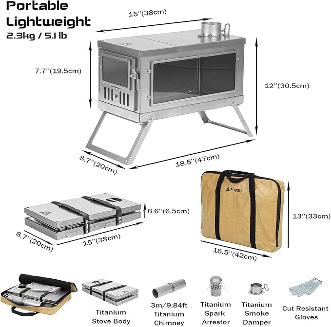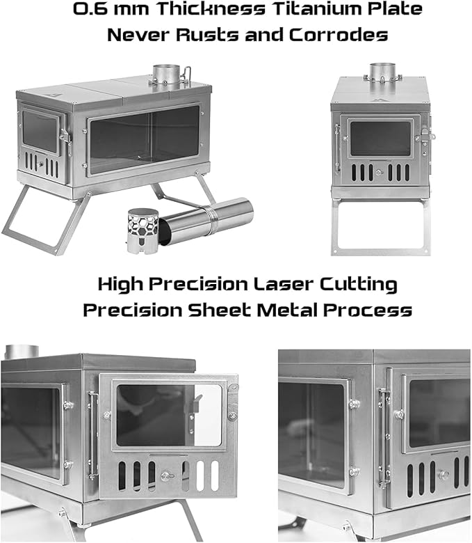 - 【ULTRALIGHT】The Timber stove is made of titanium. It weighs only 5 lb / 2.3 kg. Titanium tent stove is characterized by light weight, high hardness, no rust and corrosion resistance.
