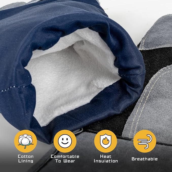 - THICK AND DURABLE MEATERIAL:Top quality natural cowhide split leather enables gloves have better control and work at high temperatures.Kevlar flame retardant thread