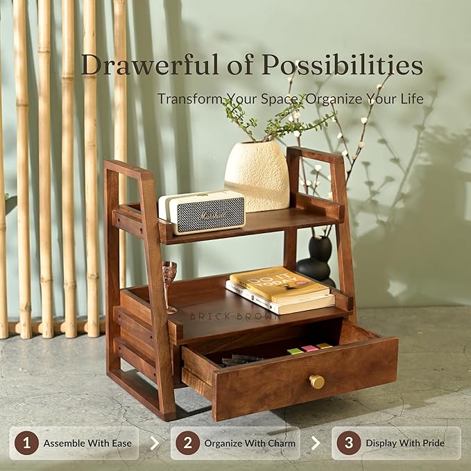 - Functionality: Beyond its stylish appearance, this organizer with a drawer is a versatile workhorse. Whether on the kitchen counter, dining table, living room, bedroom or hung as a shelf, it enhances the presentation of your essentials.