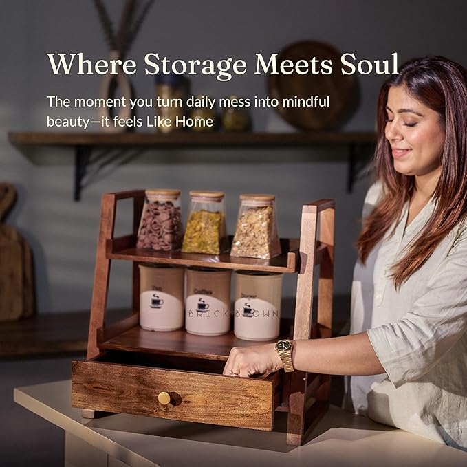 Handcrafted Versatile Organizer with Drawer | 2-Tier Kitchen Storage Organizer | Spice Rack & Jars/Bottle Holder (18x18x10.7Inch)