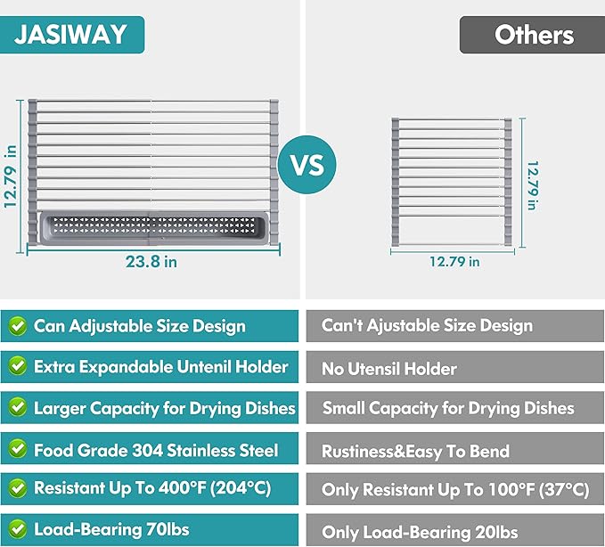 - Top Grade 304 Stainless Steel: Our foldable dish drying rack is made of 304 stainless steel, BPA-free food-safe silicone, which is sturdy, rust-resistant, corrosion-resistant, anti-slip, waterproof, high load bearing up to 70lbs, not easy to bend or twist by heavy cookware. Moreover, Heat resistant up to 400°F (204°C), dishwasher safe. What's more, the non-slip silicone on the edges holds it flat, even, and steady. Strong enough and large capacity to dry kitchen supplies.