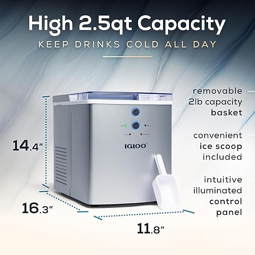 - ICE BASKET AND SCOOP: The Igloo ice cube maker comes with an easy to remove basket that can store up to 2 pounds of ice at a time. The removeable ice basket allows you to quickly move large quantities of ice cubes at a time or effortlessly fill large containers. Utilize the included ice scoop to easily fill beverage glasses or small containers.