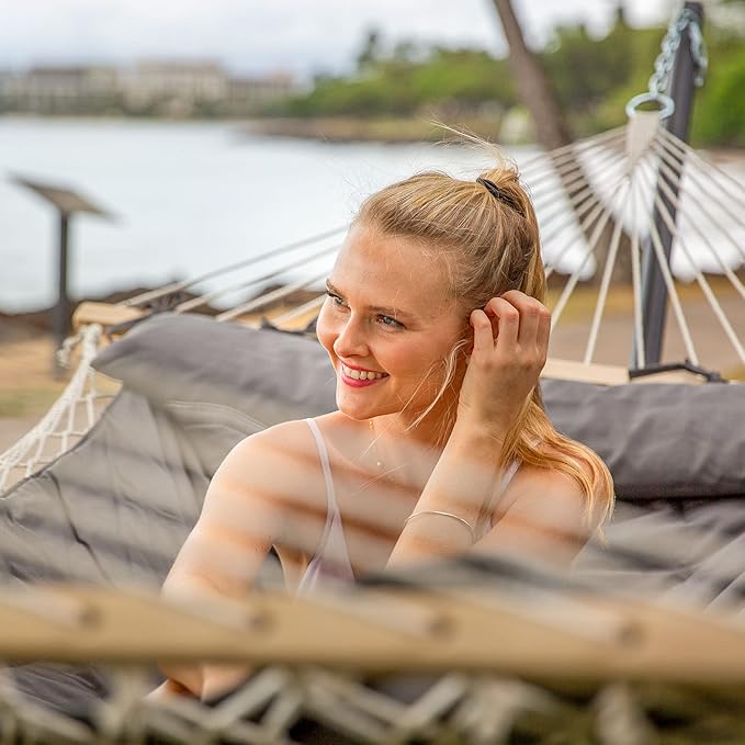 SUNCREAT Double Outdoor Hammock with Stand, Two Person Cotton Rope Hammock with Polyester Pad, Dark Gray