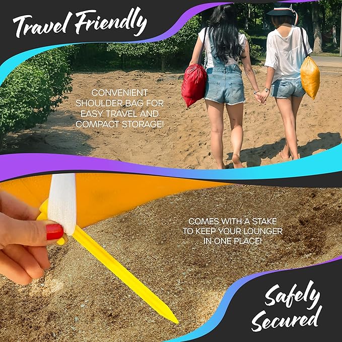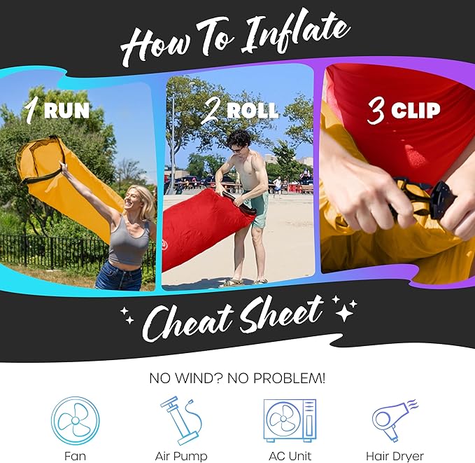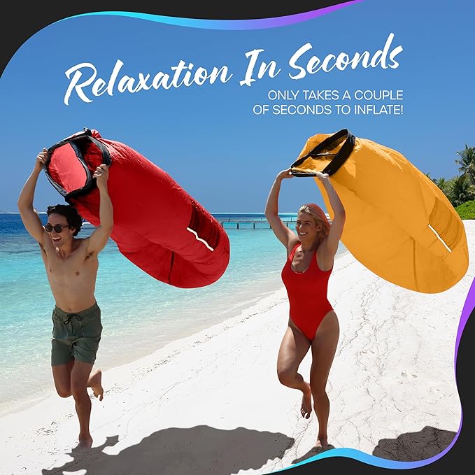 - WIND OPTIONAL SET UP: Setting up the Nevlers Inflatable Chair is as easy as 1-2-3! Simply run a few feet, roll it up, then clip it to have your banana chair ready in no time. No wind? No worries! Even if there's no breeze, you can use a fan or air pump to inflate our beach lounge chairs for adults & kids. When it's time to pack up, deflate & fold the portable couch into the drawstring bag for lightweight storage. No need to lug around bulky seating with our inflatable chairs for adults & kids.