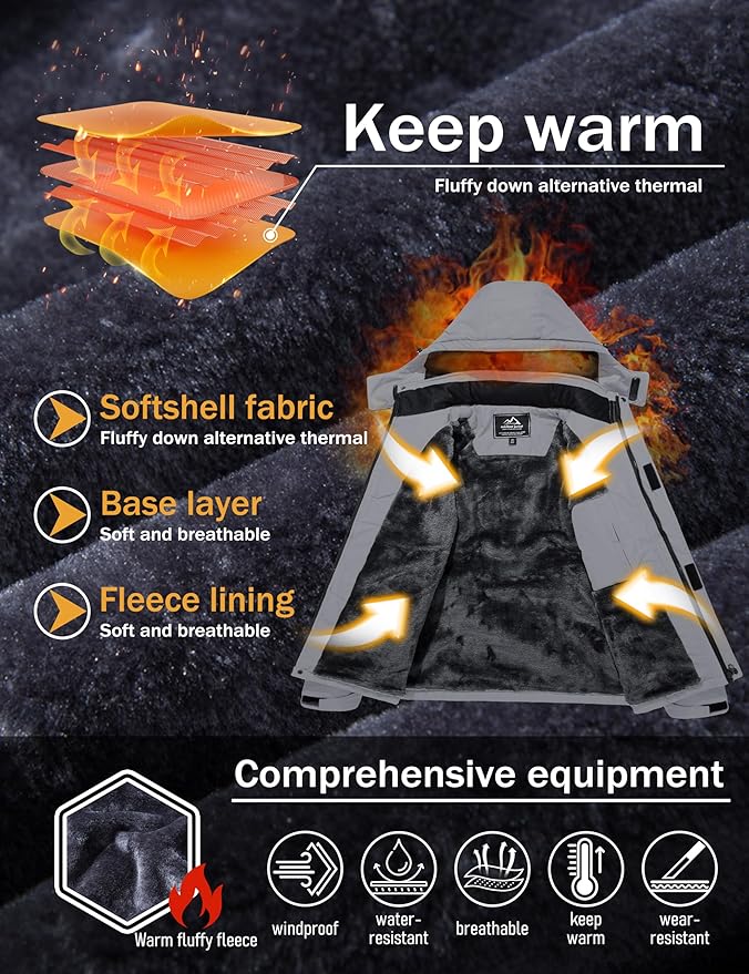 - Water repellent: Professional water repellent jacket, keep your body always dry and comfortable, you won't worry about getting wet while skiing, snowboarding, hunting, hiking in inclement weather.