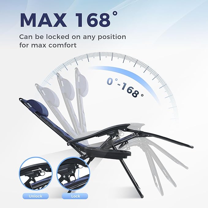 - 【Lockable Reclining System Gravity Chairs】: The lock catch is more convenient to operate than twist knobs. Simply pull the clip back to lock and push the clip front to unlock. It can be adjusted at any angle from 0 to 168 degrees, smoothly glides to an ergonomic zero-gravity position