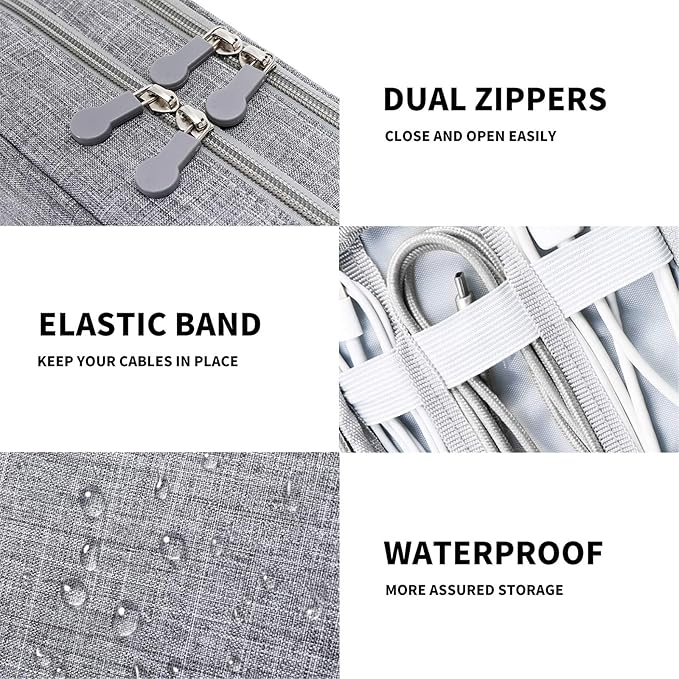 - WATERPROOF & PROTECTED - This cable case is made of water resistant polyester material. With the padded foam around to protect all the things inside the bag, the fabric is easy to clean, 2 way zippers make it easier to open and close the bag to take your charger cable or any other electronic accessories in a short time