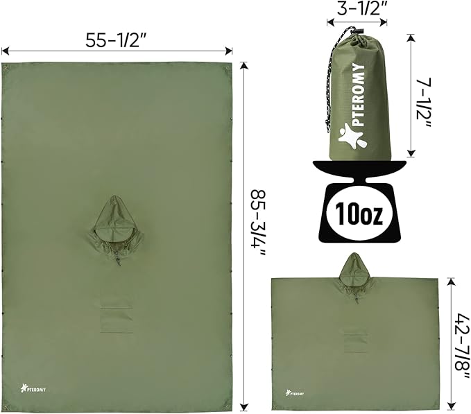 • [VERSATILE APPLICATION] One size fits most. PTEROMY rain ponchos adult is designed breathable and will keep you dry for outdoor activities of any kind such as hiking, camping, picnic, and outdoor game watching. Great gift idea for hunting gear for men, rain gear, or bushcraft gear