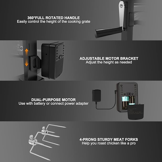 - 【Dual-purpose Motor】Grilling should be easy and effortless, thats why our rotisserie comes with a dual-purpose motor. It can be powered with 2 "D" cell batteries (battery not included), or use it with the power adapter. 360 full degaree rotation, you no longer need to sit around and turn the rod yourself.