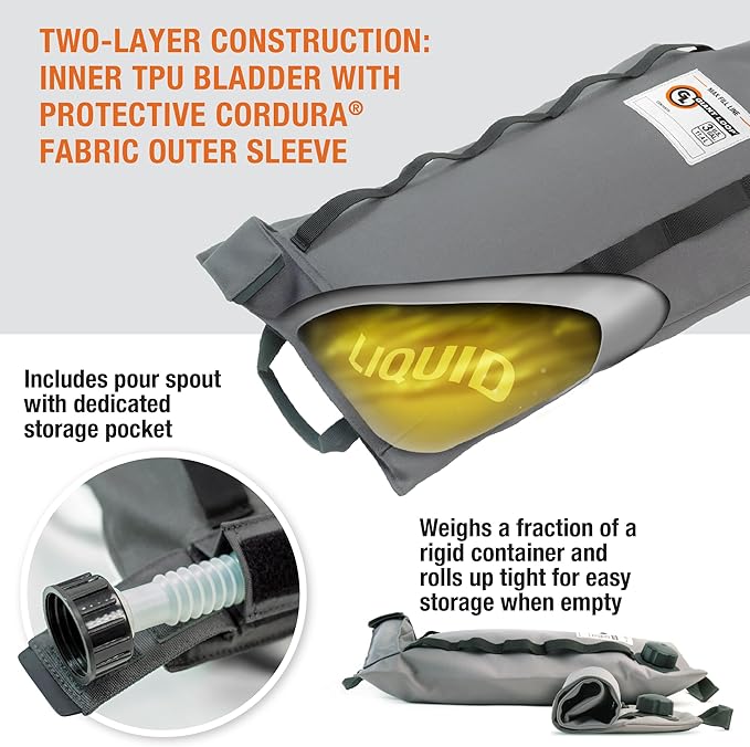 - DURABLE MATERIAL: Employs a two-layer construction, including an RF-welded inner bladder that’s protected by a highly abrasion resistant sewn Cordura outer sleeve. The bag also features webbing and rubber-molded handles that make filling and installing the pour spout and dispensing liquids easier
