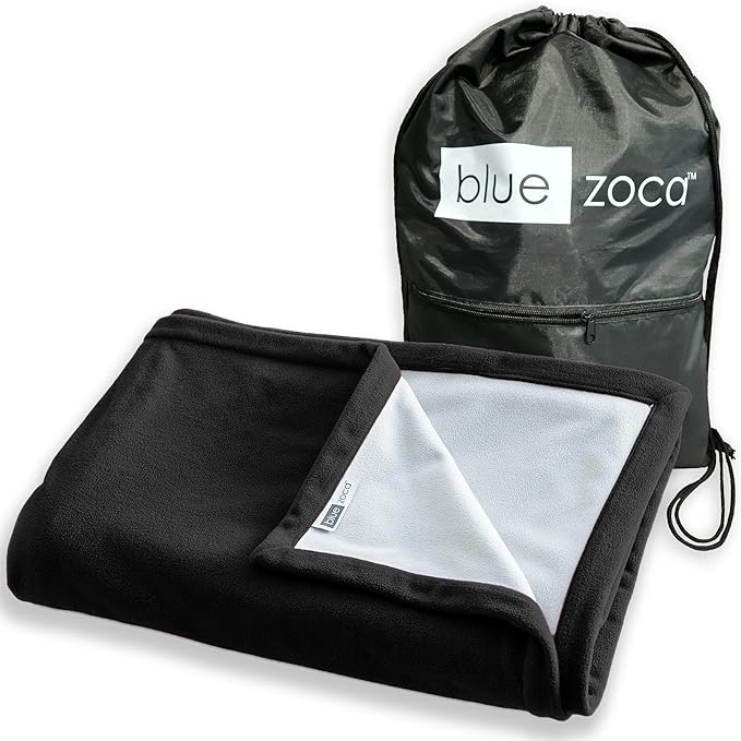 - THOUGHTFULLY SIZED PLUS A CARRYING BAG INCLUDED - Our Blue Zoca travel blankets measure 50 x 65 inches. The waterproof bag has strong shoulder straps and a zippered pocket. The blanket is easy to carry with your outdoor gear, yet big enough to lay down on and protect you from the cold, damp ground.