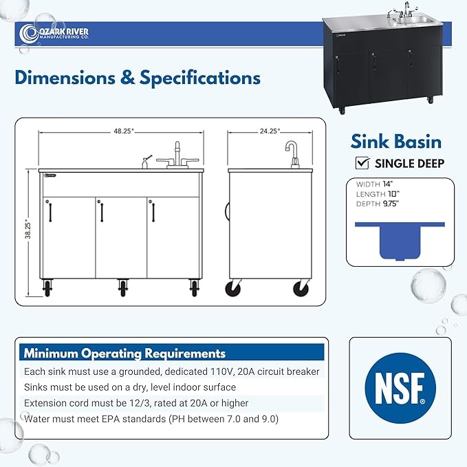 - NSF-Certified – Stay handwashing code-compliant with this NSF-certified, portable handwashing sink with hot water. Get food and medical-safety grade hot and cold water anywhere you need it. Simply plug in this self contained sink and say goodbye to code compliance questions and costs