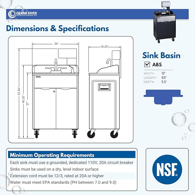 - NSF-Certified – Stay health and safety handwashing code-compliant with this NSF-certified, no-plumbing portable hand washing station. Get food and medical-safety grade hot and cold water on-demand and anywhere you need it–even outside. Simply plug in this self contained sink and say goodbye to complicated code compliance questions and costs