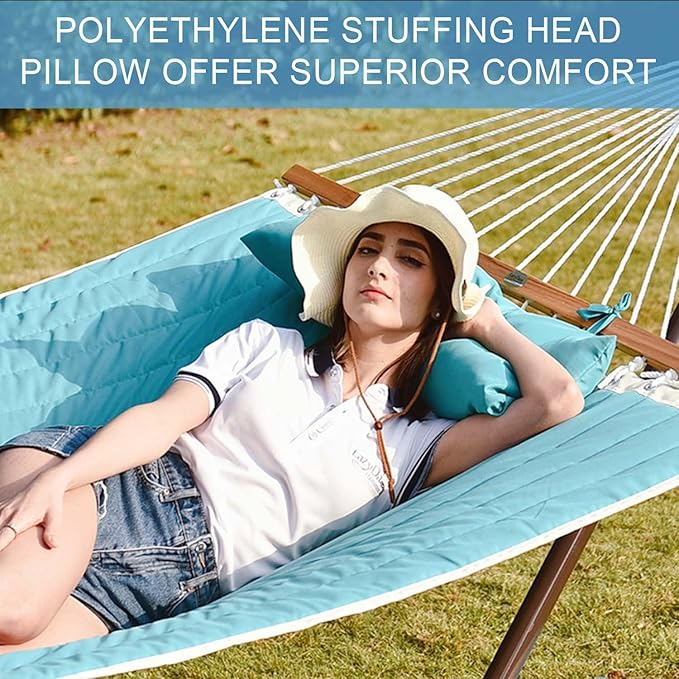 - SUPER COMFY: The double-layered quilted polyester with inner polyester padding and a polyethylene stuffing head pillow offer superior comfort. This quilted hammock can give you a cloud-like comfortable experience. Lying on it is like being in a warm embrace. No matter it's in summer or winter, this hammock will always be your first choice for relaxation.