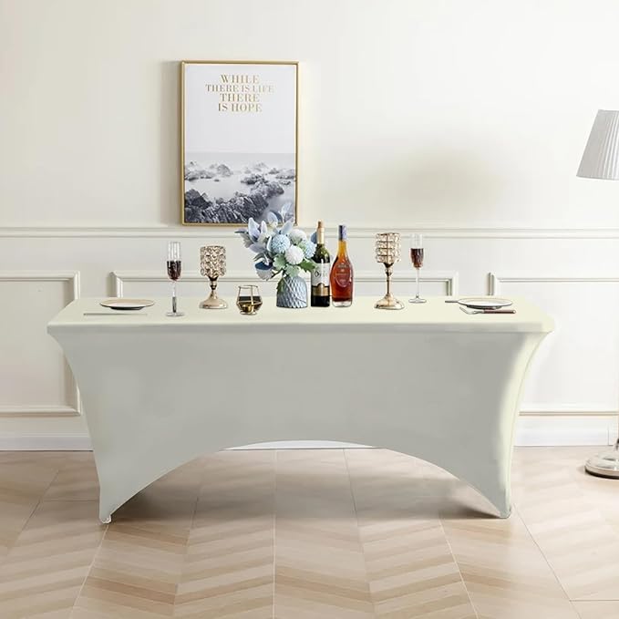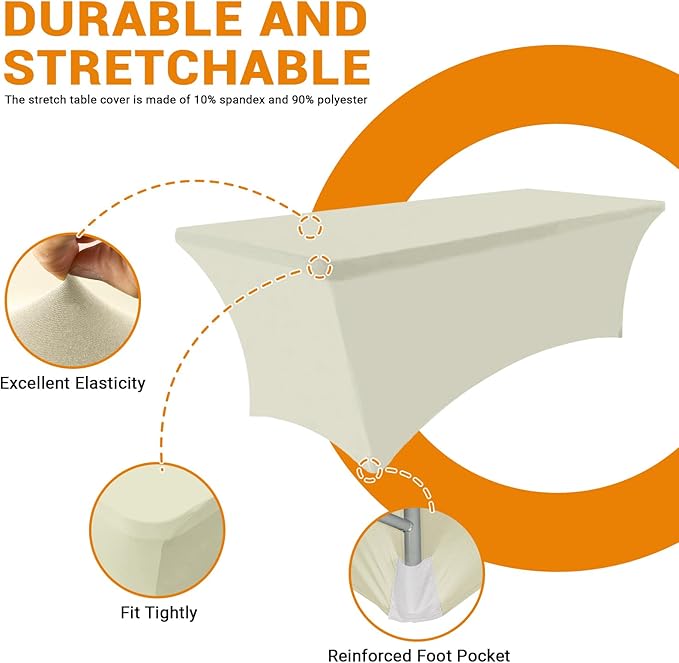 - DURABLE & SPANDEX: The stretch spandex rectangular table cover was made from 10% Spandex, 90% Polyester material, wrinkle and stain resistant stretch spandex fabric with a 200 GSM, which make tablecloth more stretchable and durable, does not require ironing and can be laundered countless times.