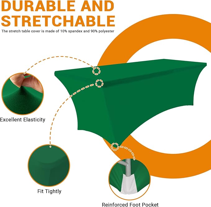 - DURABLE & SPANDEX: The stretch spandex rectangular table cover was made from 10% Spandex, 90% Polyester material, wrinkle and stain resistant stretch spandex fabric with a 200 GSM, which make tablecloth more stretchable and durable, does not require ironing and can be laundered countless times.