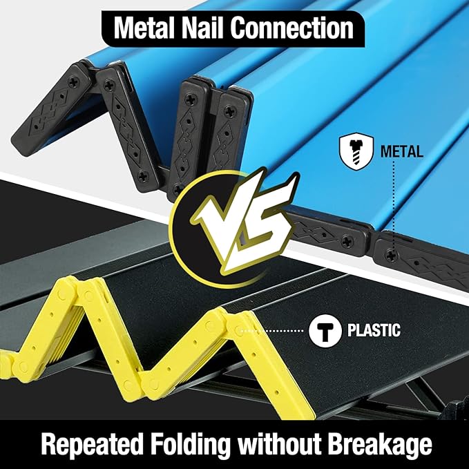 - Hinged Connection Upgrade: VILLEY camp table has a unique metal screw design that works with hinges to connect each panel of the table, unlike other similar foldable tables that are connected with bungee cords or plastic nails, heavy-duty metal nail attached hinges make the snack table more stable and durable, allow it to last for many years