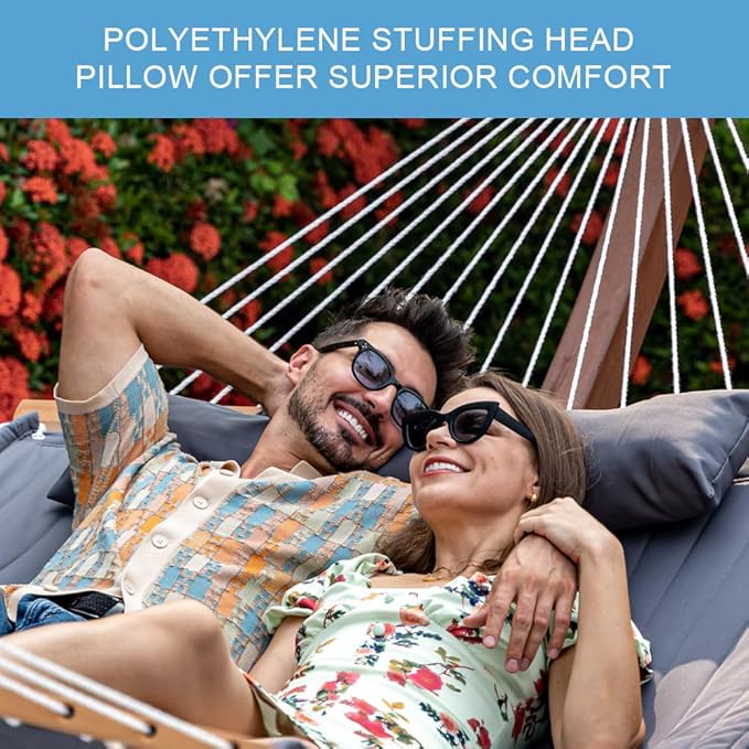 - SUPER COMFY: The double-layered quilted polyester with inner polyester padding and a polyethylene stuffing head pillow offer superior comfort. This quilted hammock can give you a cloud-like comfortable experience. Lying on it is like being in a warm embrace. No matter it's in summer or winter, this hammock will always be your first choice for relaxation.