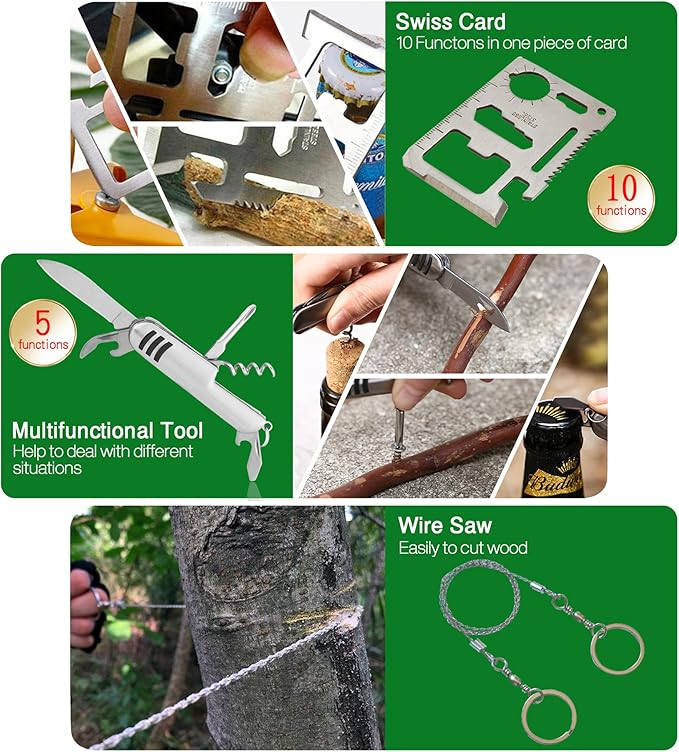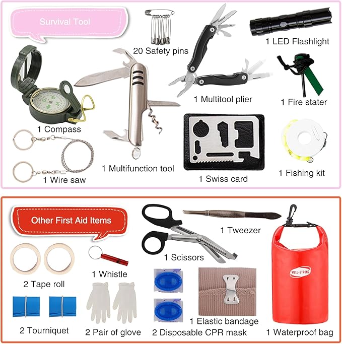 - FIRST AID & SURVIVAL KIT: We add some survival supplies in this kit on the base of first aid kit like a multi-function plier, a wire saw etc to help you solve more complicated problems in the wild.