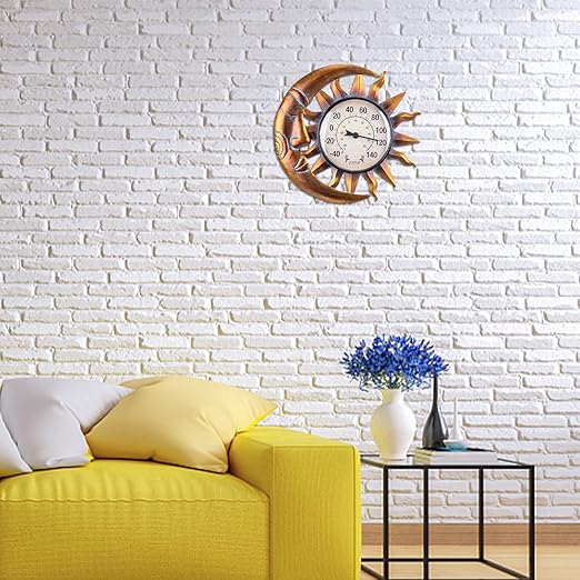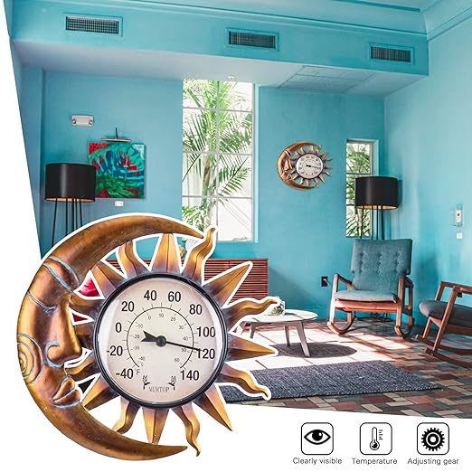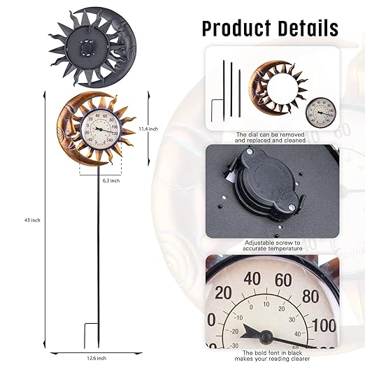 - {Outdoor Thermometer} The exterior of the indoor outdoor thermometer is designed with the SUN and Moon shape, which is both eye-catching and modern; with a garden metal stake that can be placed indoors or outdoors