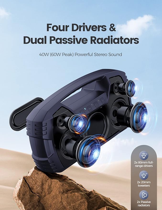 - Powerful Stereo Speaker - Featuring 4 dedicated drivers with 2 15W full-range drivers and 2 5W tweeters, along with 2 passive radiators on the front and rear, this loud Bluetooth speaker delivers 40W surround sound (peak 60W) and pumps out well-balanced midrange, crisp treble, and punchy bass with virtually no distortion, letting you enjoy the music to the utmost. Pair 2 speakers together for 80 watt stereo sound