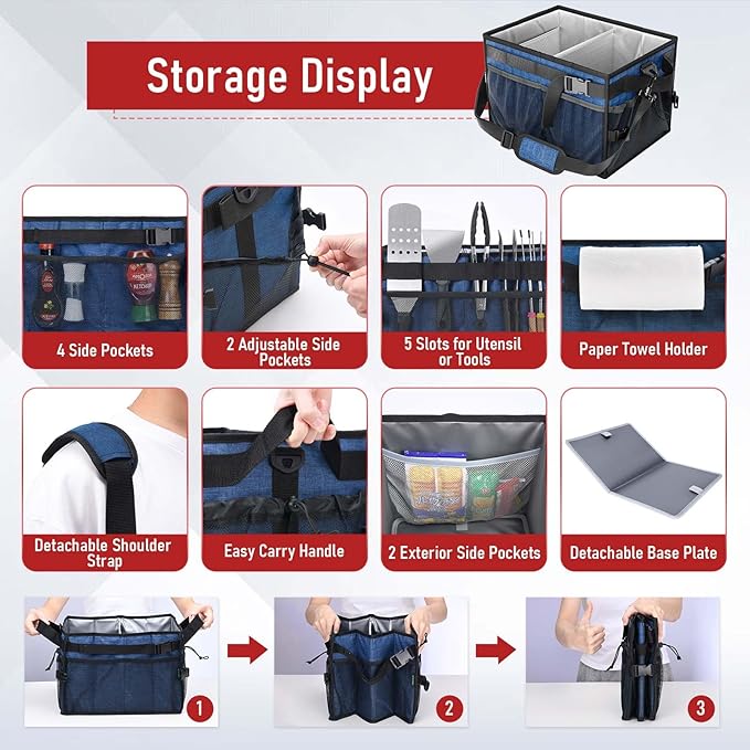 - Easy Carry & Versatile- Features with a detachable padded shoulder strap and easy carry handle for your convenience, make carrying stuff in and out to outdoor activities much easier, saves your time repeated between grill and your kitchen, a great table tool caddy for grilling, picnic, patio, camping, barbecue, outdoor dinner, griddle, rv, also a great gift for grilling lover and camper