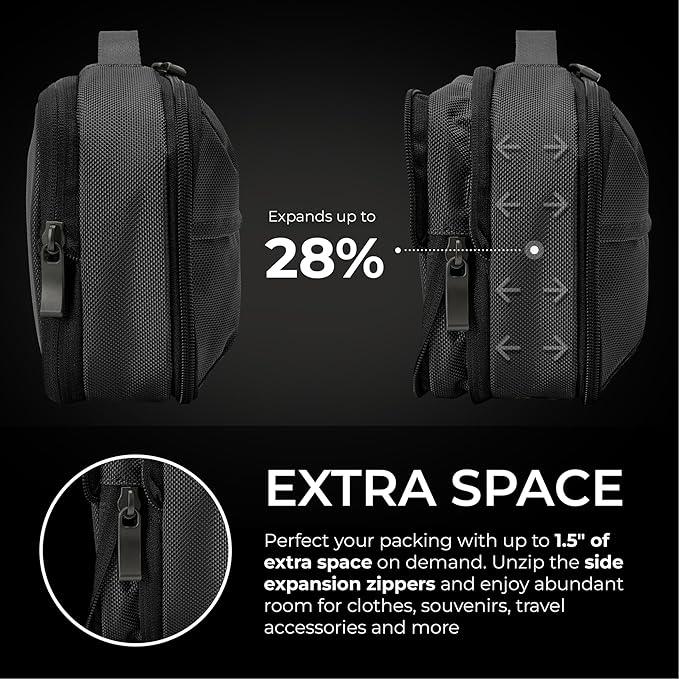 - EXPANDABLE DOPP KIT - Bring all your essential toiletries with you: our zip-around expansion system creates up to 1.5” of extra packing space