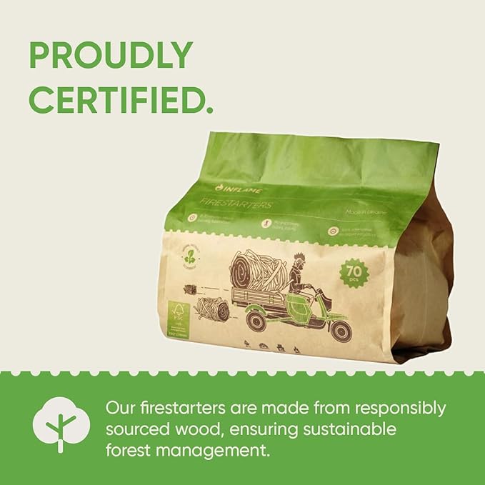 Inflame Fire Starters 70 pcs Fire Starters for Campfires, Grill, BBQ, Fireplace, Woodstove - Charcoal Starter - Waterproof, Weather-Resistant - Natural Wood Fireplace Starters