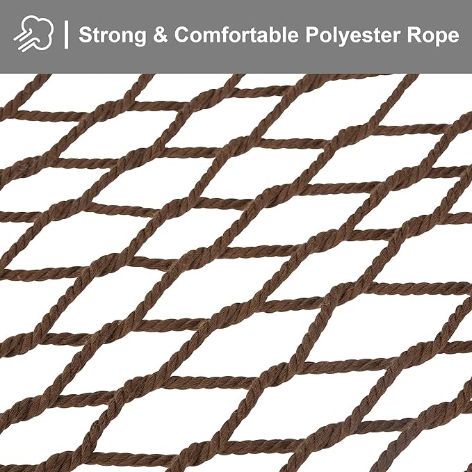 - Strong Max-Density Rope: Polyester ropes are weather resistant and won't sag after long term use. The 3 ply twisted polyester ropes ensure maximum density and perfect flexing capability. The 20 suspension cords at both ends of the hammock bed ensure even weight distribution and better balance. Skilled artisans meticulously hand weave the bed to achieve the precision and balanced loops
