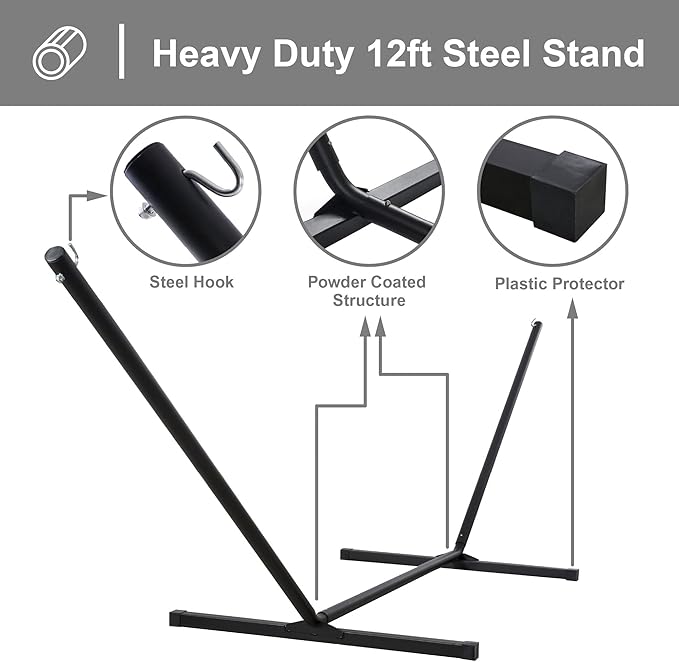 - Freestanding Hammock with Portable Stand: No damage to trees. Created to be stable and long-lasting, the 12 ft stand is made from powder-coated heavy gauge steel. It can be easily assembled in minutes without any tools, and it could be disassembled easily, making it to be a portable hammock. Feel free to contact us if you have any questions during use within one year of purchase. We are always here to help