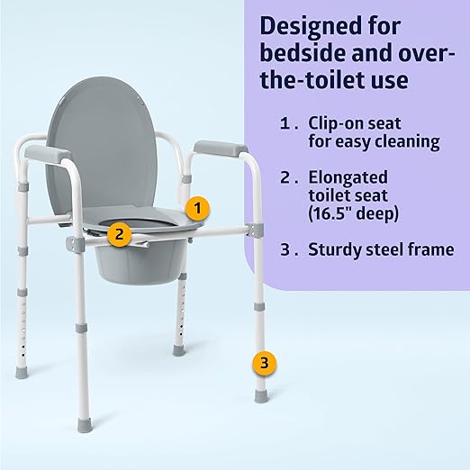 - Versatile 3-in-1 Design: This folding steel commode serves multiple purposes, functioning as a bedside commode, raised toilet seat, or toilet safety frame, providing convenience and adaptability