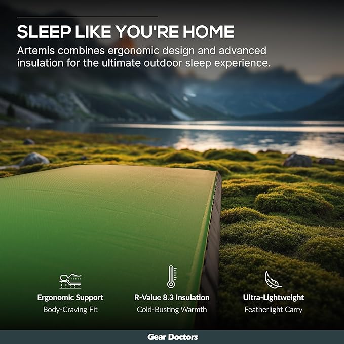 - The Ultimate Campsite Luxury: Artemis 3D self-inflating sleeping pad Air-Foam hybrid offers the comfort of an expensive home mattress, 4" thick with an R-Value of 8.3 for warmth in cold nights, [79"×27.2”] size, and packs [27.5"×9.4"] 6.4 lbs. Elevate your camping experience with ultimate luxury