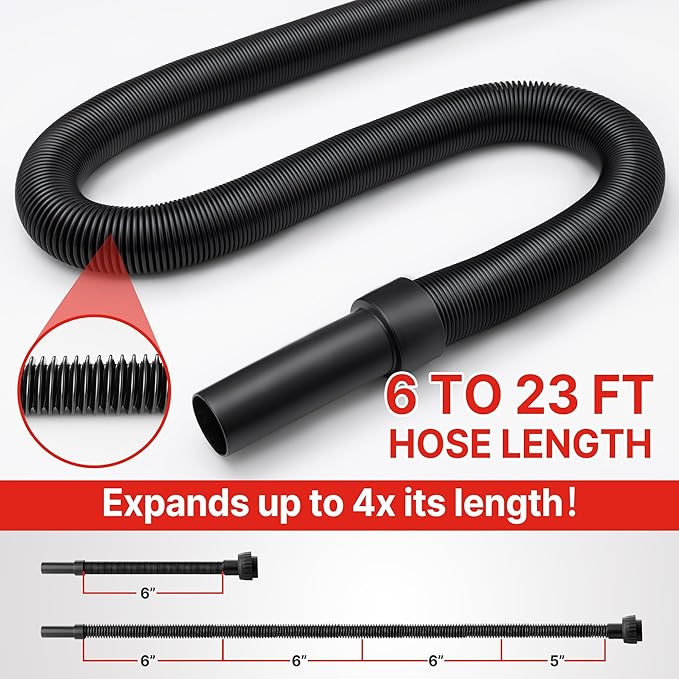 - LARGE CLEANING RANGE: The vac has an extra long 6-23’ extendable hose. Reducing the movement of the Vacuum Cleaner greatly and making your cleaning jobs much easier. Ideal size for virtually any cleanup.